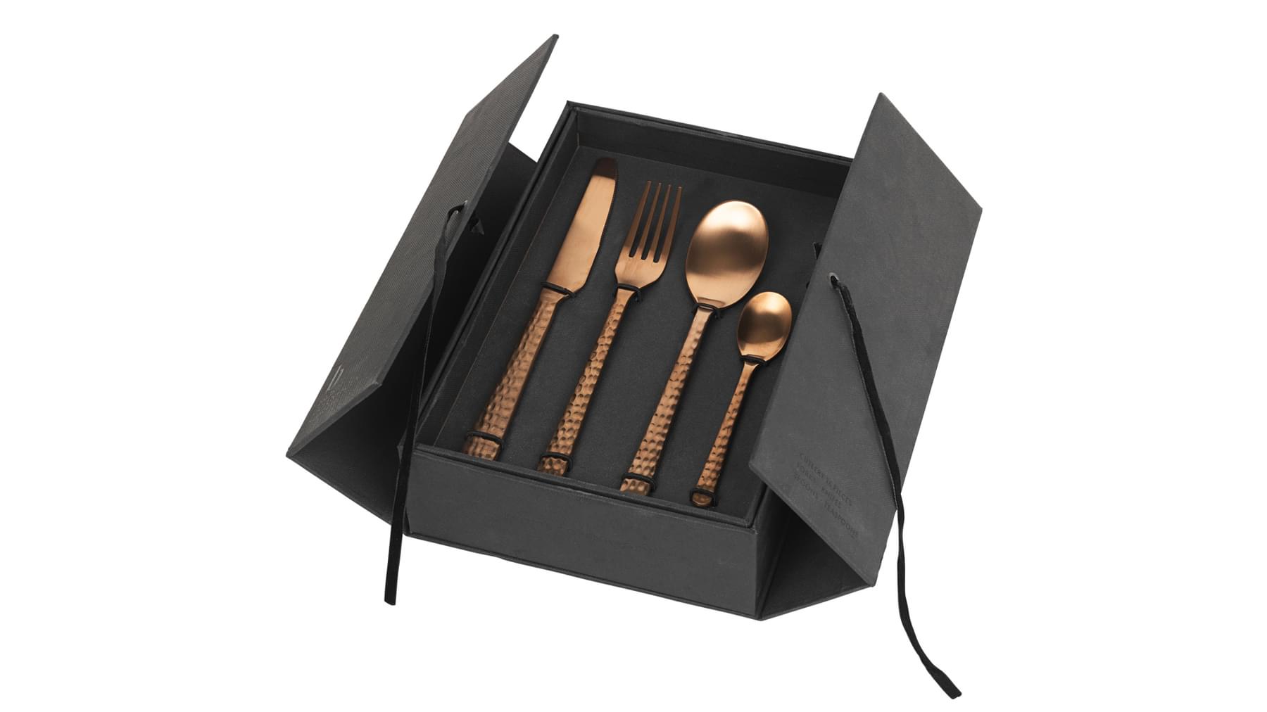Þetta klassíska og fallega hnífaparasett er með hamraðri áferð, úr ryðfríu stáli með koparhúðun.