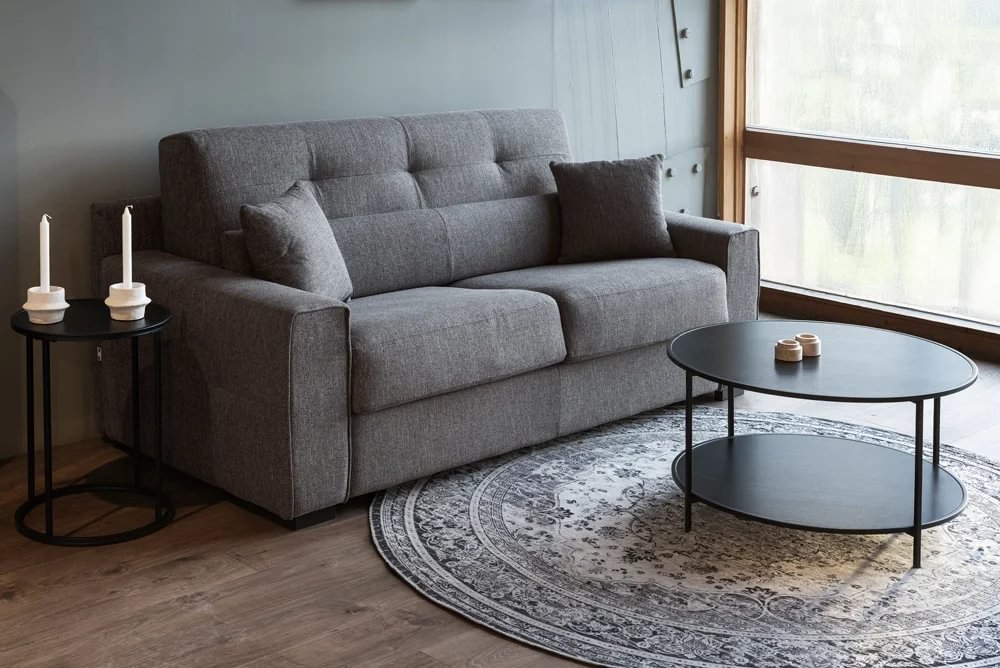 Vandaður og veglegur ítalskur svefnsófi. Bak er dregið fram á einfaldan hátt til að opna fjaðrandi stálgrind sem á liggur18 cm há og vönduð svampdýna (fylgir). Fæst í tveimur gráum tónum. Þægilegur fyrir gestina þína hvort sem þeir sitja eða liggj