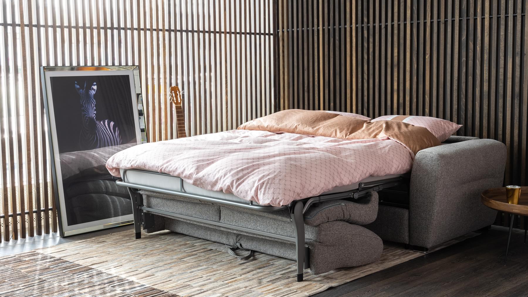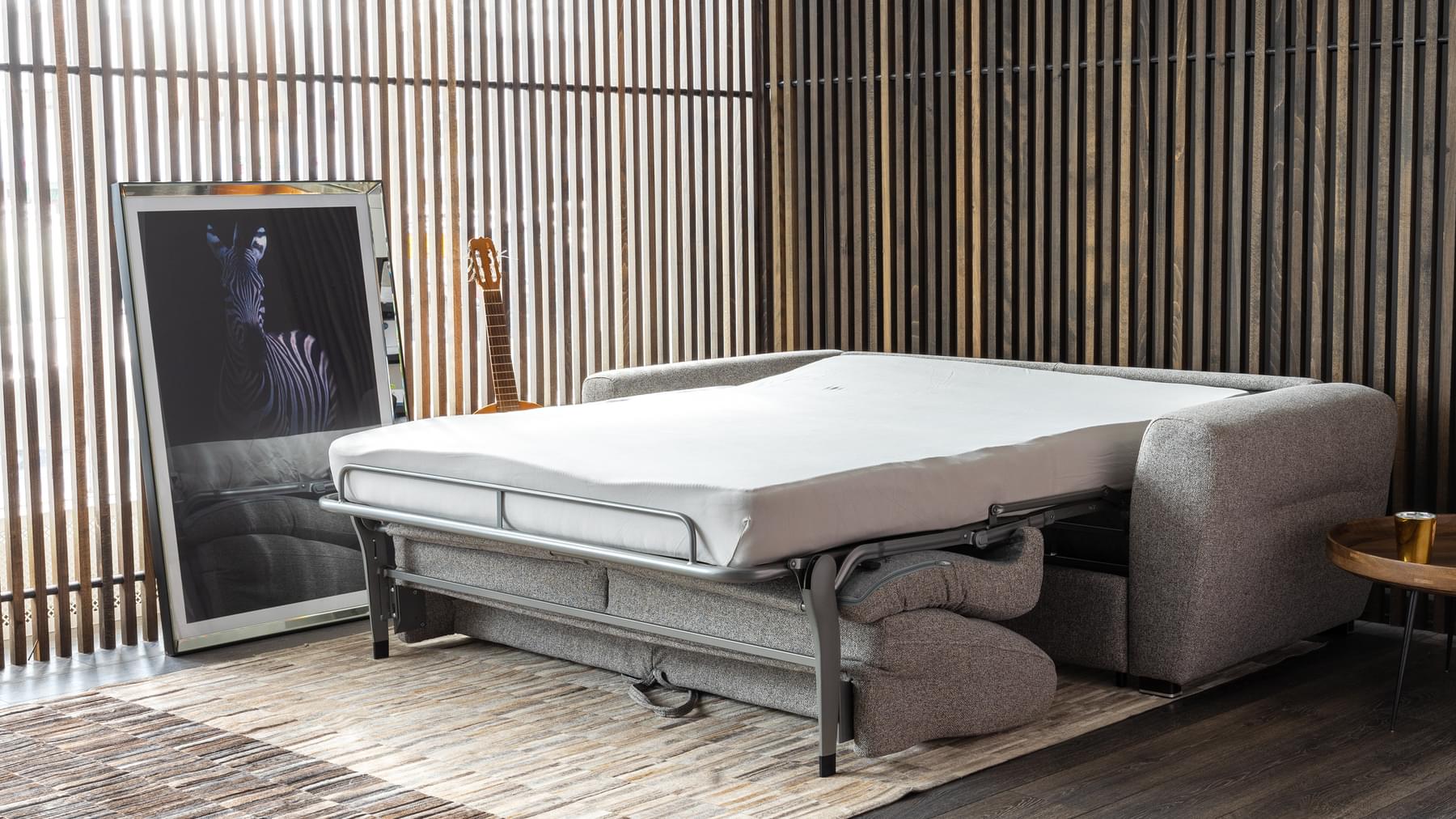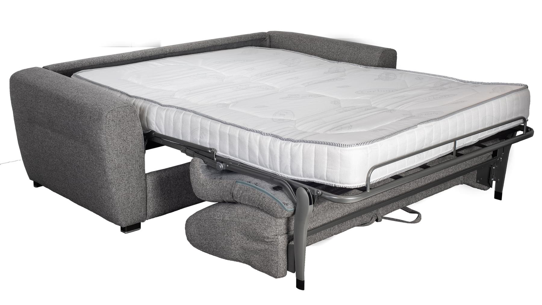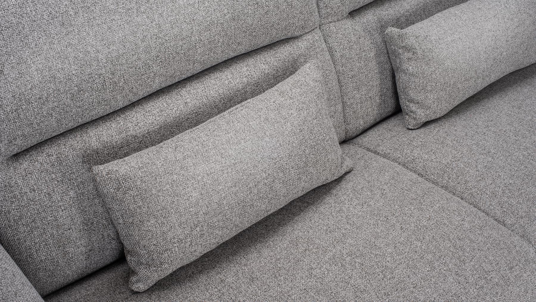 Lolly svefnsófinn er sterkur og vandaður. Þú opnar svefnsvæði (140×190 cm) með því að draga bak sófans fram og opna stálgrind með fjaðrandi botni og 18 cm þykkri heilsudýnu. Lolly fæst í nokkrum gráum tónum af áferðarfallegu og slitsterku áklæði.