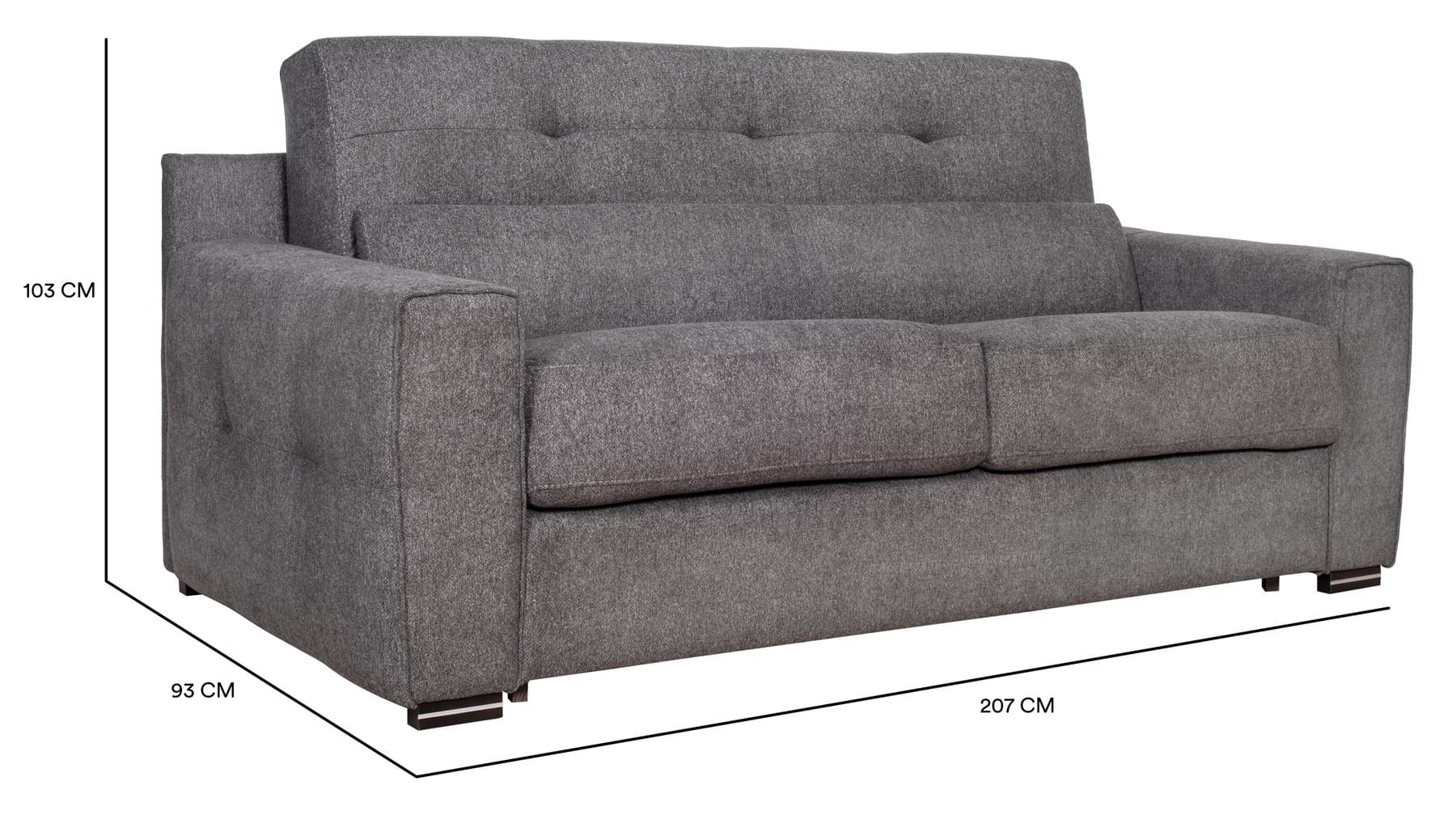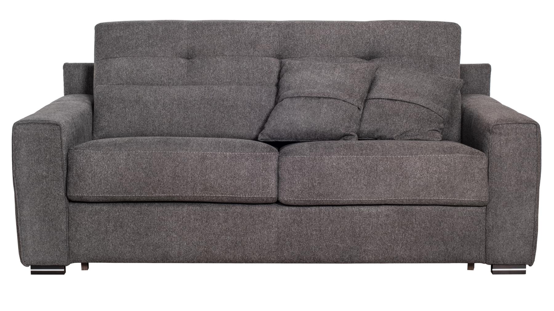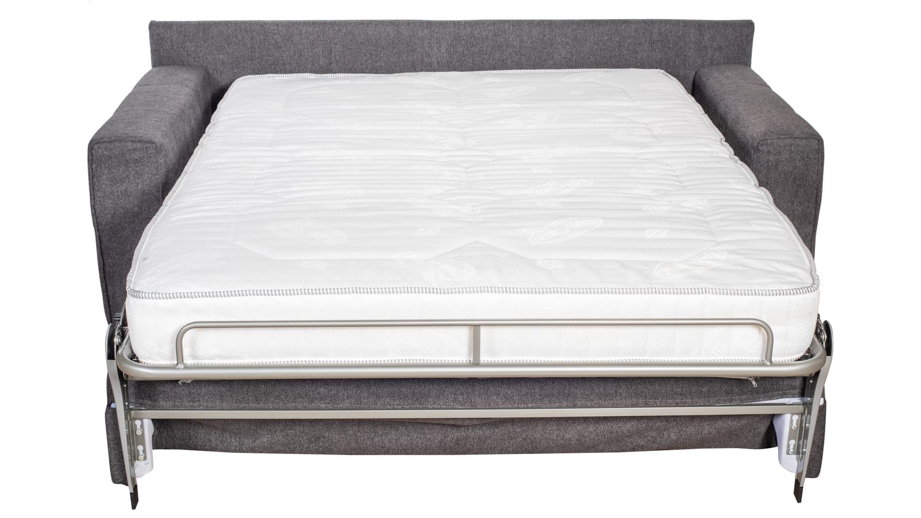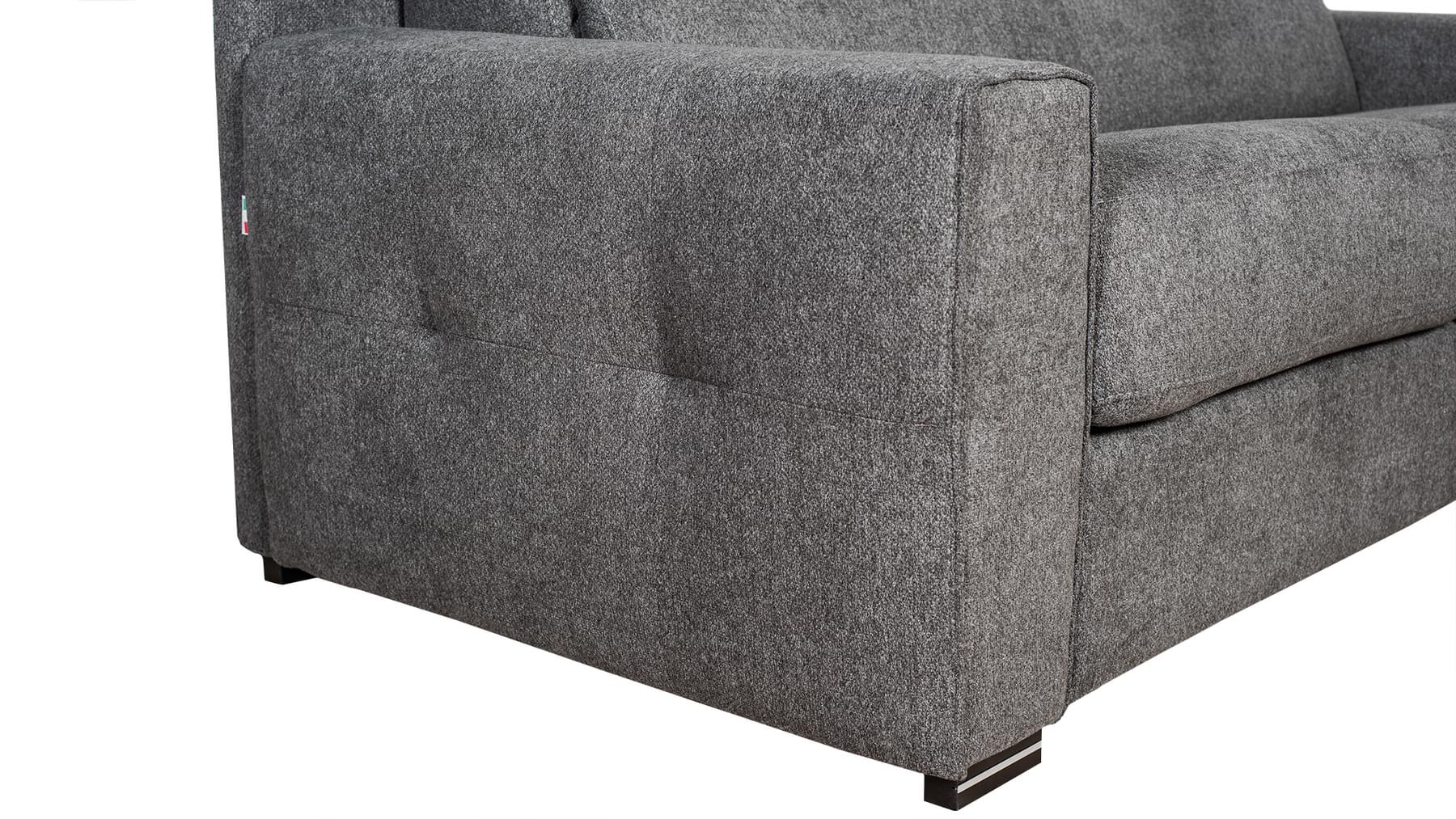Vandaður og veglegur ítalskur svefnsófi. Bak er dregið fram á einfaldan hátt til að opna fjaðrandi stálgrind sem á liggur 18 cm há og vönduð svampdýna (fylgir). Fæst í tveimur gráum tónum. Þægilegur fyrir gestina þína hvort sem þeir sitja eða liggja.